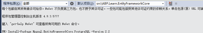 Install-Package Npgsql.EntityFrameworkCore.PostgreSQL -Version 2.2
