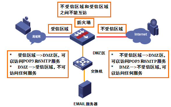 1)不受信区域:一般指的是Internet,主要攻击都来自于这个区域。