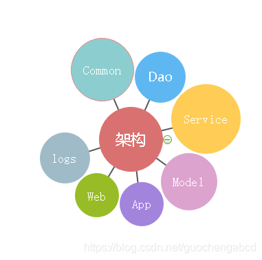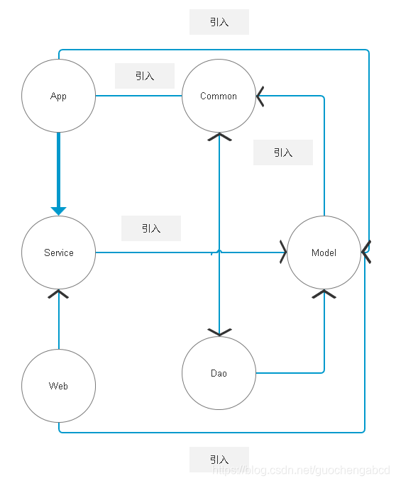 App(app请求接口全部在这里),Web(web请求接口全部在这里)、Dao(数据层)、Model(抽象数据层)、Service(业务层)、Common(所有通用工具在这里,任何模块接口访问)