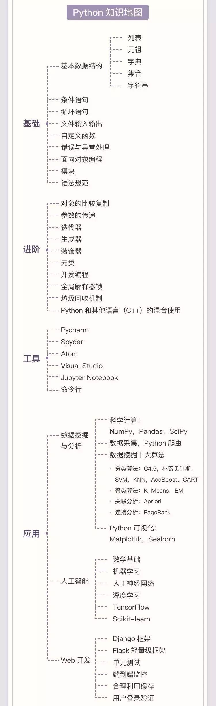 清晰的目标就在眼前,那就没什么能阻挡我们前进的步伐了。“我怎么去?”虽说条条大路通罗马,但高手出招讲究快狠准,手拿地图,按图索骥,才能事半功倍。下面这张 Python 知识地图你一定要牢记在心。