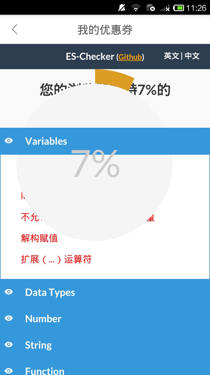 第二次测试er拿来一款几百年前的小米手机,具体啥型号的都懒得看了,总是很老很老,报错如上,于是同样用上面的检测插件检测了下该webview对es6的支持程度,结果不出意外,支持度是7%,连检测插件的ui都不兼容。如下图所示。
