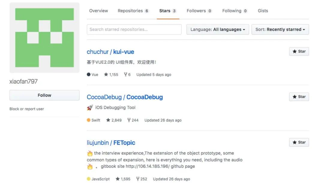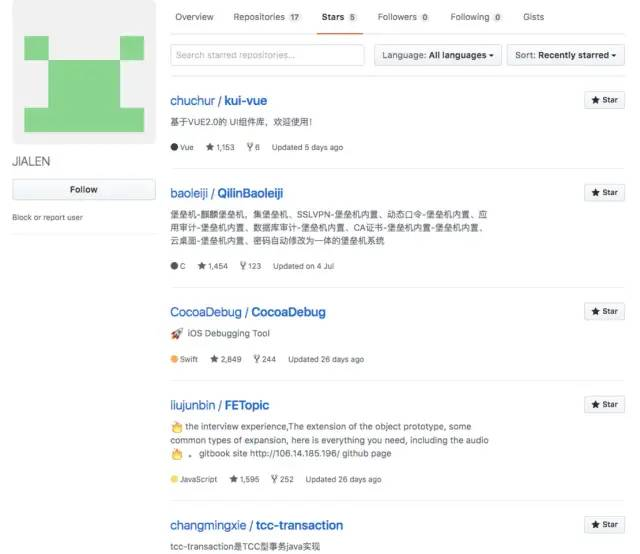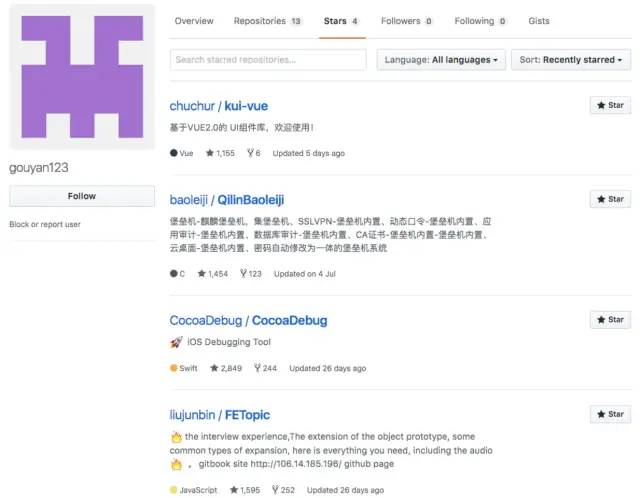 都不想再多截图了,我随手按顺序看了几个用户都这样,有没有发现一个共同点,他们都 star 了QilinBaoleiji,CocoaDebug,FETopic。而且是:有且只 star 了这几个项目。而且这个项目 fork 少的可怜。。。