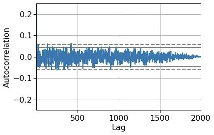 ▲自关联。Lag 表示两个样本之间相隔的样本个数,纵坐标表示自关联。可以看到 thin=2000 时才基本上完全消除了自关联。