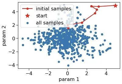 ▲ 红星是在参数空间中探索的开始位置,红色连线是初始的几步探索,蓝色圆点是后期在参数空间探索留下的足迹——所以有些库将抽样得到的参数列表用英文 trace(迹) 表示。