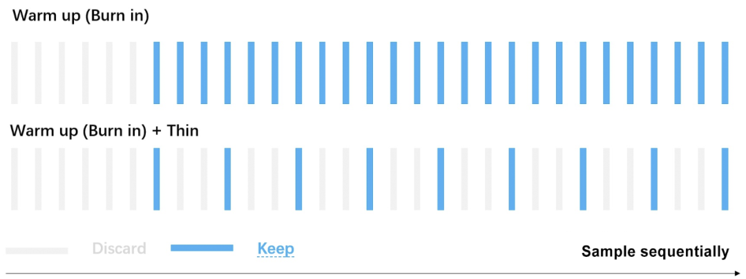 这两个参数都表示要扔掉部分样本。warmup=0.1 表示在样本列表的最前端扔掉 10% 的样本,thin=10 表示在剩下的样本中每隔 10 个样本保留一个。下图中蓝色是保留下的样本,灰色是扔掉的样本。