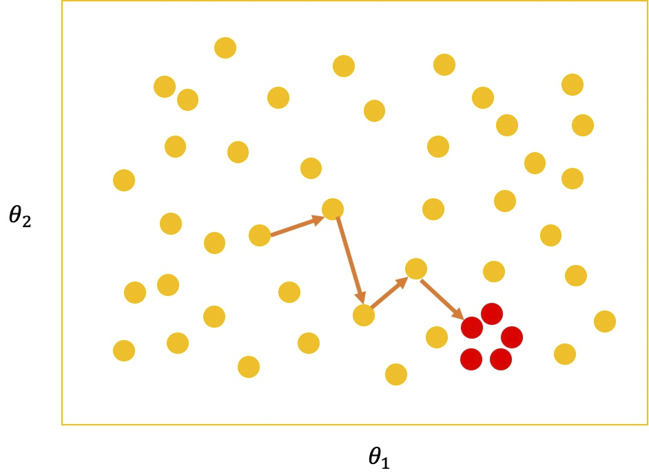 ▲ 二维参数空间。黄色圆点对应低 likelihood,红色圆点对应高 likelihood 区域,模型可以近似描述实验。贝叶斯分析要从参数空间的某一点出发,通过随机游走,快速找到高 likelihood 区域。如果红色区域很大,则很多参数点都能描述实验,后验分布是某个参数点的机会降低。
