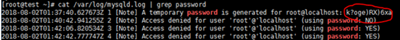 cat /var/log/mysqld.log | grep password (这个是装机后的临时密码,修改密码后没有用处,所以修改后的密码必须记住或保存)