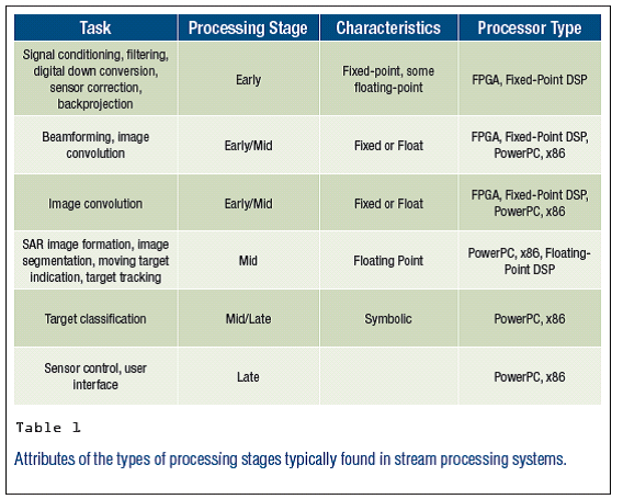 在一些流处理应用中,除了有一些回馈信息需要从后期处理阶段传回前期处理阶段,数据流动的主要方向还是单向流动。前期处理阶段更接近DSP处理,而后期处理更接近于符号处理。处理类型的不同,每个处理阶段使用的硬件有所区别,请参考表1