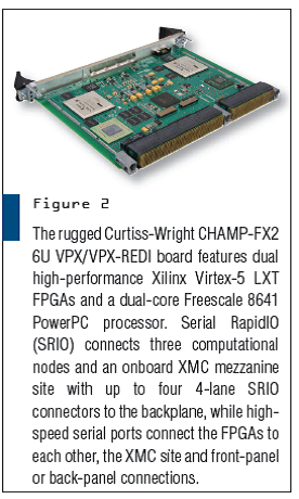 开发的加固的、商业板子满足了流处理应用的需求,它采用6U VPX/VPX-REDI格式,板子上有两块LXT FPGA和一个双核8641D PowerPC处理器(如图二)。