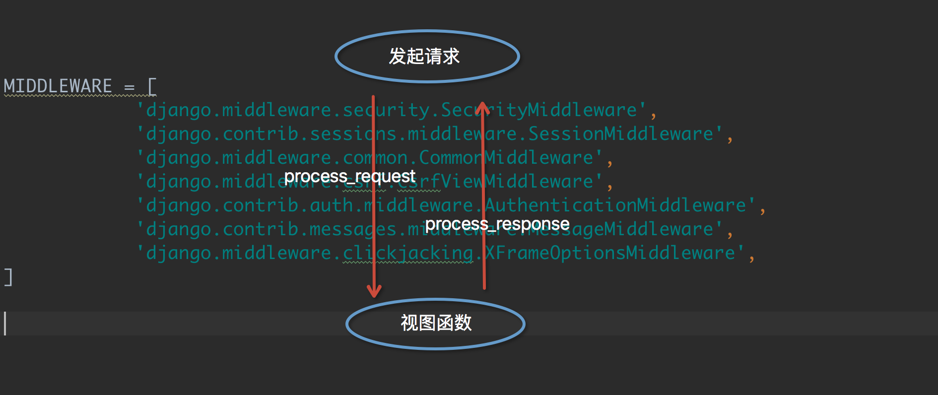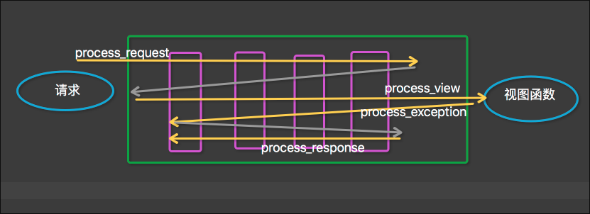 当用户发起请求的时候会依次经过所有的的中间件,这个时候的请求时process_request,最后到达views的函数中,views函数处理后,在依次穿过中间件,这个时候是process_response,最后返回给请求者。