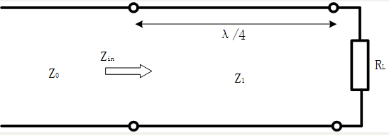 若负载电阻$R_L$和馈线特征阻抗$Z_0$都是实数并假定已知,为了使反射系数为0,则有$Z_{in}=Z_0$,特性阻抗$Z_1$为 $$ Z_1=\sqrt{Z_0Z_L} $$ 他是负载与源阻抗的几何平均。因而在馈线上没有驻波,然而在$\lambda$/4匹配段内会有驻波存在。