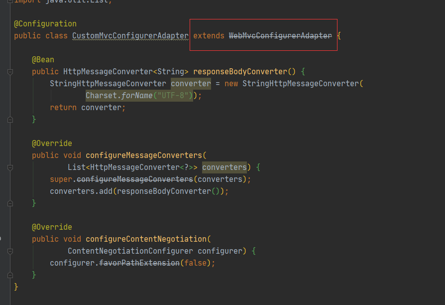 百度来的基本上都是长这样。不过在spring5版本WebMvcConfigurerAdapter这个类已经过时。其替代方式是实现WebMvcConfigurer接口或者继承WebMvcConfigurationSupport。不过如果使用WebMvcConfigurationSupport,则会使springboot的mvc自动装配失效。失效的原因是