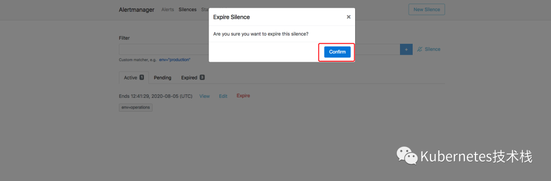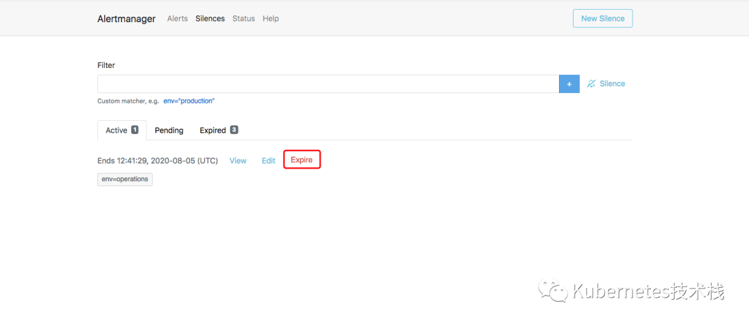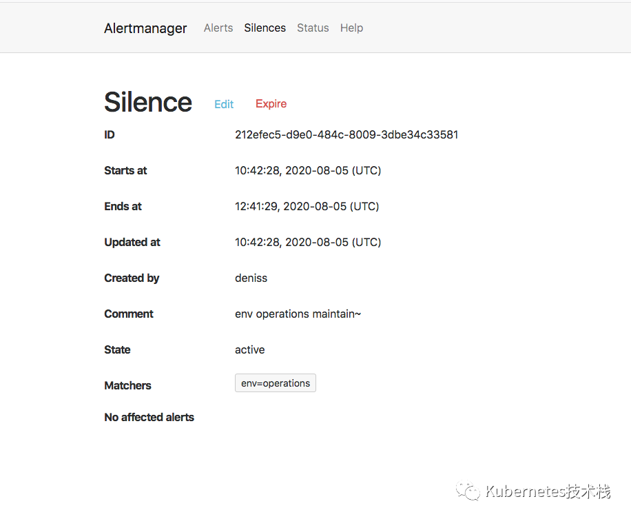 这个时候我们可以假设维护,并没有完成,用 Expire 来模拟维护时间达到,然后在 Alerts 中我就可以看到警报了,相关的通知会发送到对应的Receiver中。