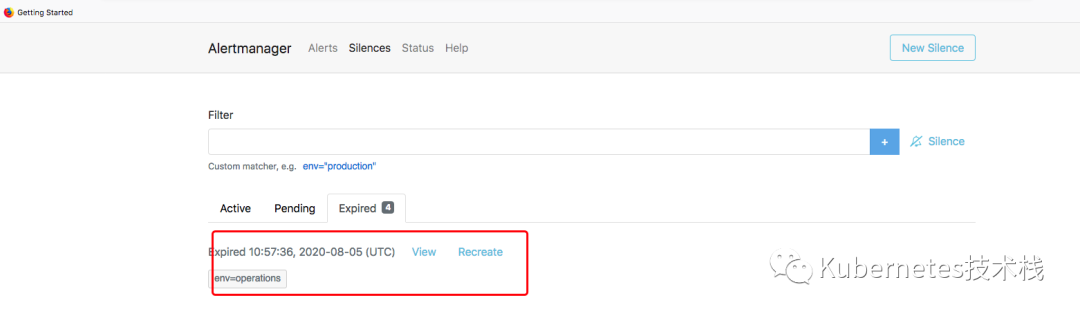 通过上面的描述其实可以很容易知道需要制定的参数信息,当输入完成后,直接点击create创建即可,此时去触发警报就会发现,警报不会在通知,下面是已创建好的Silences信息。