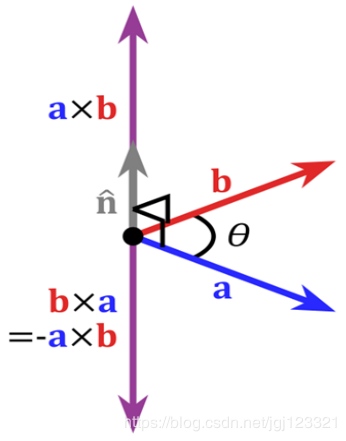 在三维几何中,向量a和向量b的外积结果称为法向量,该向量垂直于a和b向量构成的平面。在3D图像学中,外积的概念非常有用,可以通过两个向量的外积,生成第三个垂直于a,b的法向量,从而构建X、Y、Z坐标系。如下图所示: