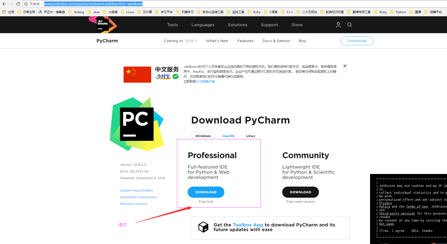 下载地址:http://www.jetbrains.com/pycharm/download/#section=windows