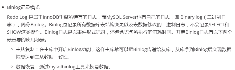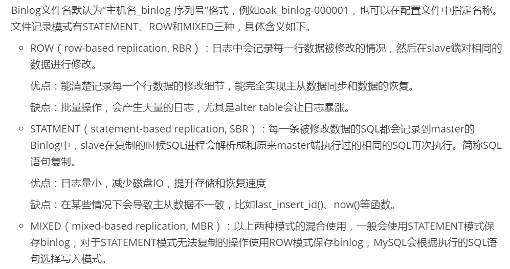 目录 Binlog日志介绍 Binlog的记录模式 Binlog的文件结构 Binlog日志介绍 二进制log,别于数据库引擎的redo log。 binlog记录记录DML DDL 。 Binlog的记录模式 statement 有点像redis的 rdb持久化。 Binlog的文件结构 这个log的格式了解即可,查看log时再来查询。 来源:oschina链接:https://my.oschina.net/u/4306931/blog/4874139 标签 mysql rdb Redis