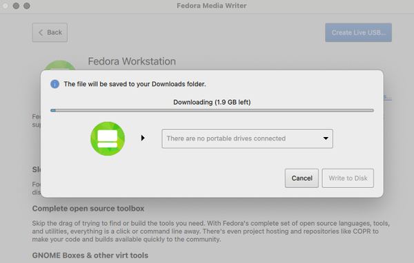 我登上了另一台 MacBook,访问了 Fedora Workstation 网站,它有 Fedora Media Writer 的链接。点击你的机器类型的图标(在我的例子中是苹果标志),你会得到一个安装包。