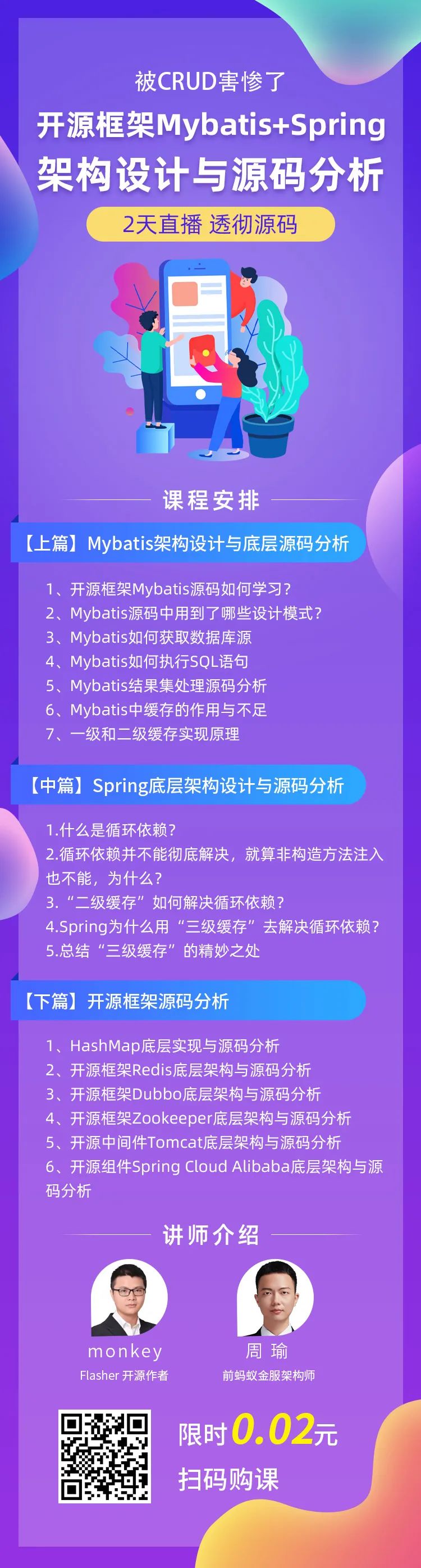 一个人阅读源码相当费力,不如来听这节限时0.02元的开源框架源码分析课程,课程内容涵盖:Mybatis、Spring、SpringCloud Alibaba等等。