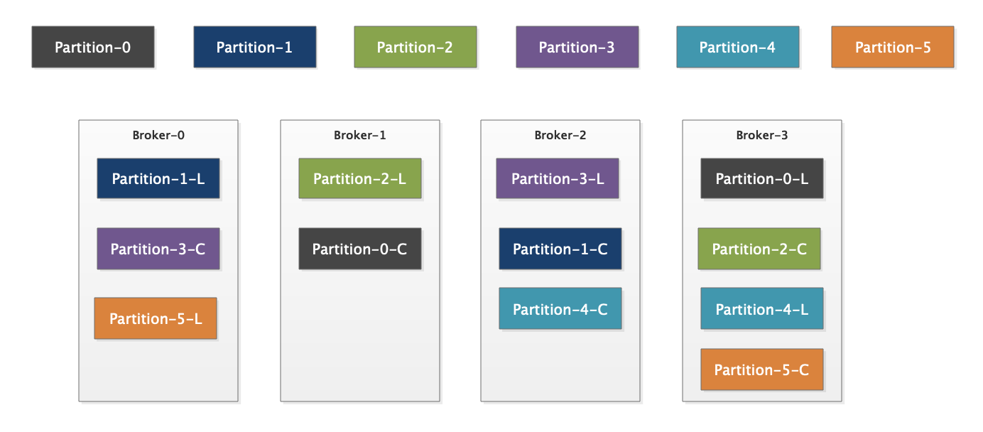 通过上边的描述信息,可以得到如下图分配方式 -L:Leader -C:Replicas(副本)
