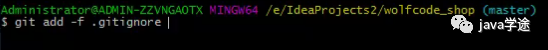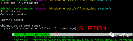 提交项目到远程仓库:添加ignore文件在进行add . ,但是ignore文件也要提交上去,ignore文件的内部第一行就将自己给忽略了,我们要将它强制提交,或者删除第一行之后再提交;