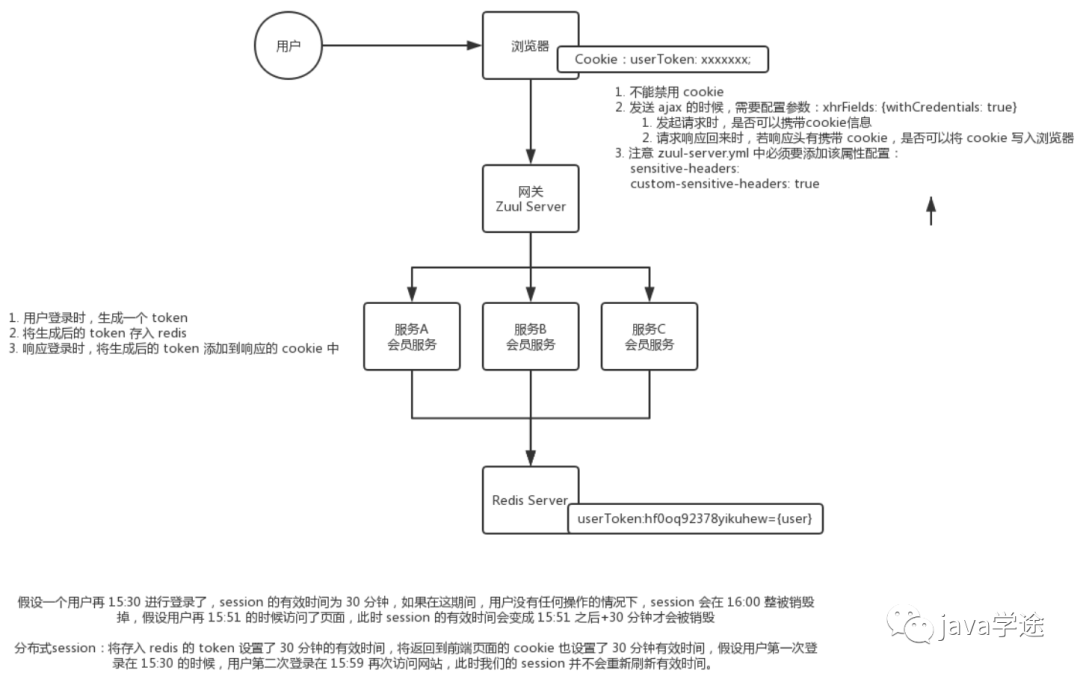 因为是分布式微服务,用在服务端的session来存储的话,访问其他服务的时候获取不到会员服务中的session;选择将用户信息存在Redis中,存储的是以随机唯一数token做key,用户做value保存,让下一次请求带着token来Redis中查数据看用户是否登陆过;