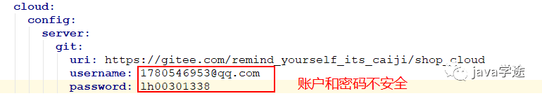 config-server的配置文件中,这样的方式关联gitee不安全;工作中一般使用SSH的方式来连接。还有一种本地的方式配置,但这种方式不能热更新,用得少。