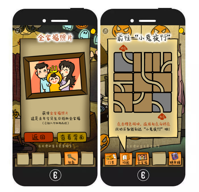 内容特色:这是一款解谜小游戏H5,游戏共分为三个部分,在第一部分,用户需根据提示通过点击、滑屏操作在客厅、厨房中寻找线索;在第二部分,用户需通过点击橙色砖块连接起点与终点;在第三部分,用户需在7个小鬼中找出扮成小鬼的宝贝。游戏结束后,用户可根据提示按钮再玩一次、将作品分享出去或跳转至品牌的专题活动页。