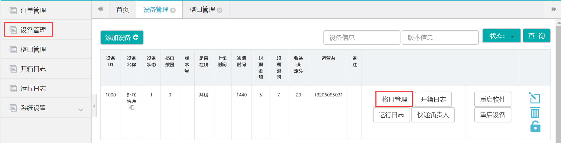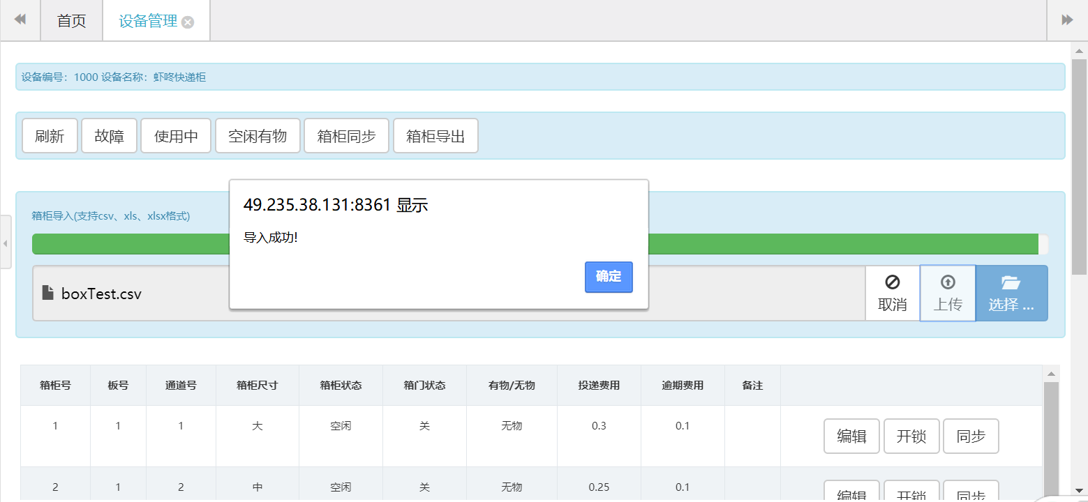 设备管理->格口管理->选择boxTest.csv->导入格口信息