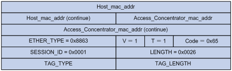 l Code域:8bits,PPPoE报文类型。Code域为0x00,表示会话数据。Code域为0x09,表示PADI报文;Code域为0x07,表示PADO或PADT报文;Code域为0x19,表示PADR报文;Code域为0x65,表示PADS报文。报文的具体情况请参见附录部分。