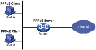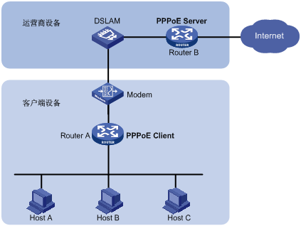 PPPoE使用Client/Server模型,PPPoE的客户端为PPPoE Client,PPPoE的服务器端为PPPoE Server。PPPoE Client向PPPoE Server发起连接请求,两者之间会话协商通过后,PPPoE Server向PPPoE Client提供接入控制、认证等功能。