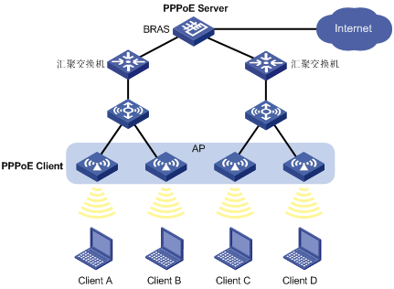 AP设备作为PPPoE Client,BRAS设备作为PPPoE Server,终端用户可以直接通过无线网络访问Internet。