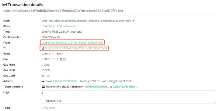 表面上和这个全零地址没有任何关系,但是智能合约执行过程中,内部会向这个全零地址转账0.001ETH。