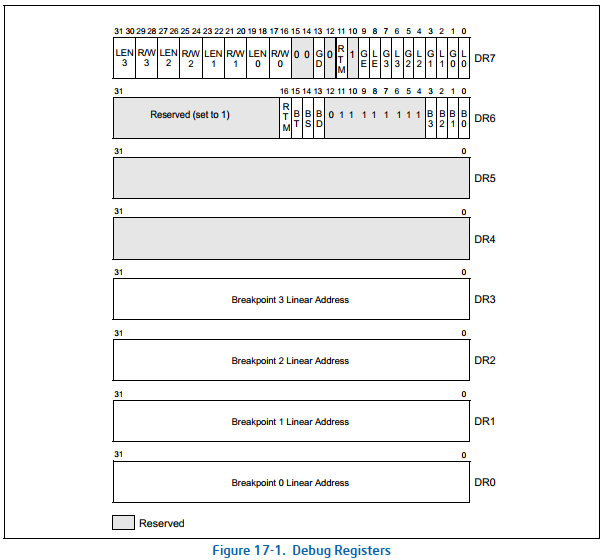 关于硬件断点,详情可以查看 在Intel手册 Volume3 Chapter 17.2 Debug Registers