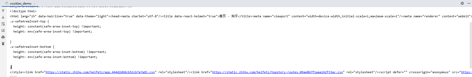简单讲一下实现思路,将上面复制下来的 cookies 使用 split() 进行切割,然后使用 set() 方法将 key 和 value 赋值到 RequestsCookieJar 这个对象中,然后在访问知乎的时候将 RequestsCookieJar 赋值给 cookies 参数即可。需要注意的是这里的 header 参数不能少,只是原来 header 里面的 cookies 无需再设置了。