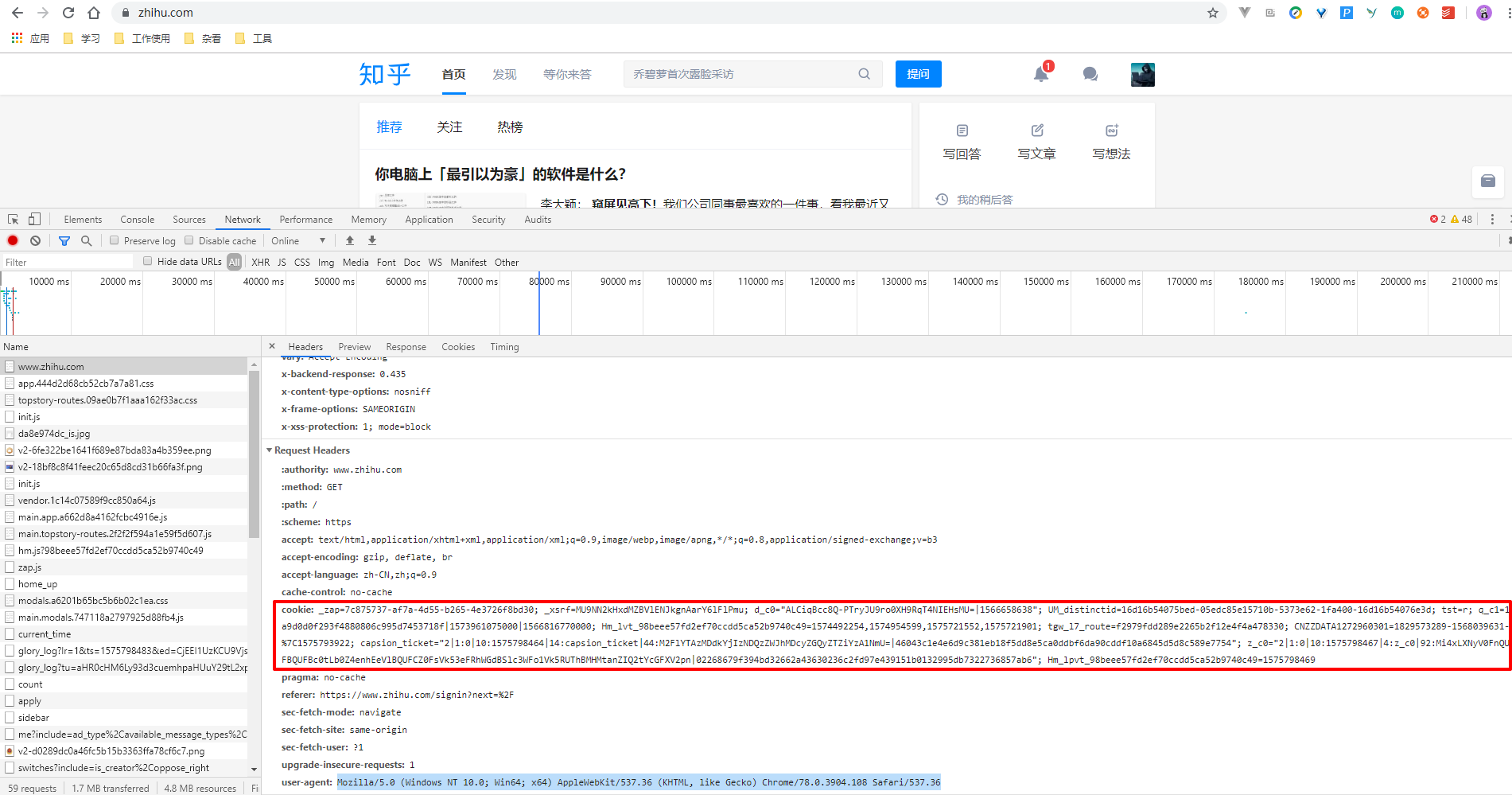 'cookie': '_zap=7c875737-af7a-4d55-b265-4e3726f8bd30; _xsrf=MU9NN2kHxdMZBVlENJkgnAarY6lFlPmu; d_c0="ALCiqBcc8Q-PTryJU9ro0XH9RqT4NIEHsMU=|1566658638"; UM_distinctid=16d16b54075bed-05edc85e15710b-5373e62-1fa400-16d16b54076e3d; tst=r; q_c1=1a9d0d0f293f4880806c995d7453718f|1573961075000|1566816770000; Hm_lvt_98beee57fd2ef70ccdd5ca52b9740c49=1574492254,1574954599,1575721552,1575721901; tgw_l7_route=f2979fdd289e2265b2f12e4f4a478330; CNZZDATA1272960301=1829573289-1568039631-%7C1575793922; capsion_ticket="2|1:0|10:1575798464|14:capsion_ticket|44:M2FlYTAzMDdkYjIzNDQzZWJhMDcyZGQyZTZiYzA1NmU=|46043c1e4e6d9c381eb18f5dd8e5ca0ddbf6da90cddf10a6845d5d8c589e7754"; z_c0="2|1:0|10:1575798467|4:z_c0|92:Mi4xLXNyV0FnQUFBQUFBc0tLb0Z4enhEeVlBQUFCZ0FsVk53eFRhWGdBSlc3WFo1Vk5RUThBMHMtanZIQ2tYcGFXV2pn|02268679f394bd32662a43630236c2fd97e439151b0132995db7322736857ab6"; Hm_lpvt_98beee57fd2ef70ccdd5ca52b9740c49=1575798469',