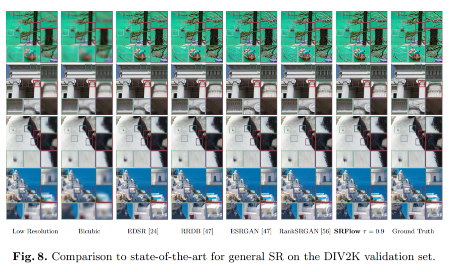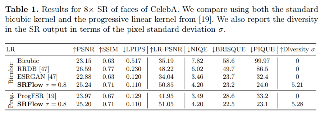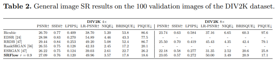 与基于 GAN 的方法 [47,56] 相比,SRFlow 实现了明显更好的 PSNR、LPIPS 和 LR-PSNR 结果,并在 PIQUE 和 BRISQUE 方面也得到了出色的结果。
