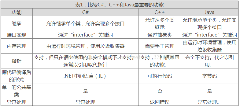 了解表1总结的重要语言功能之后,请继续往下阅读,了解C#和Java的一些重要区别。