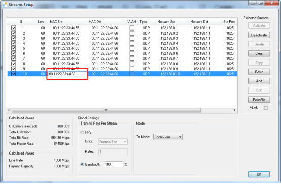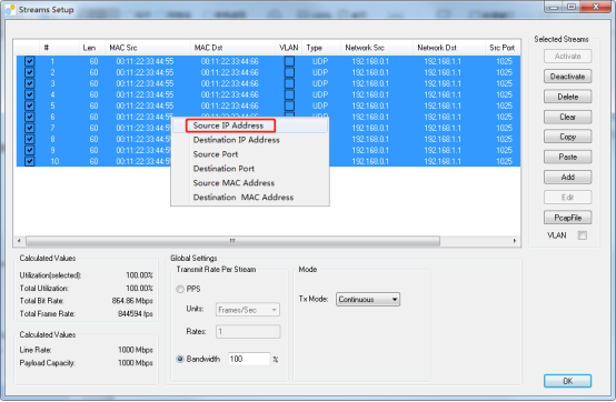 可以按ctrl+a,选中所有数据流,右键,在右键菜单中选择相关参数,对所有数据流进行修改。如统一修改源ip地址: