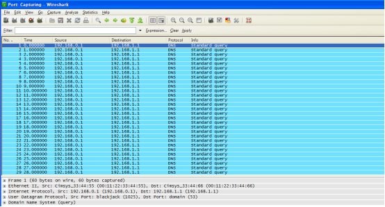 用户只需要在指定的端口图标中,点击start capture键,将会弹出窗体,供用户选择在本地安装的wireshark软件连接,从而Windows系统会自动起用wireshark应用程序,通过点击该程序的左上角第一个图标即可得到如下捕获数据报文的界面
