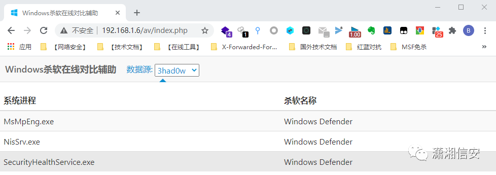 有实战经验的老哥在看到“此脚本包含恶意内容,已被你的防病毒软件阻止。”提示时就知道是Windows Defender拦截的,我们拿目标机器上的进程列表到“Windows杀软在线对比辅助”上对比了一下发现确实存在。