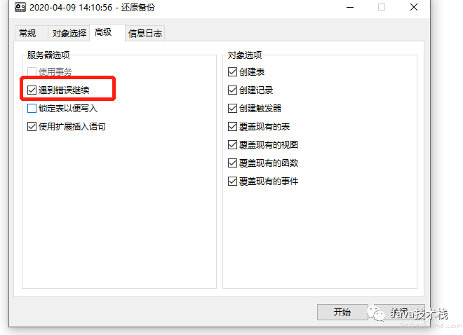 后来网上查找资料发现是,遇到错误就停止了。所以更改了还原的配置,再次进行还原。