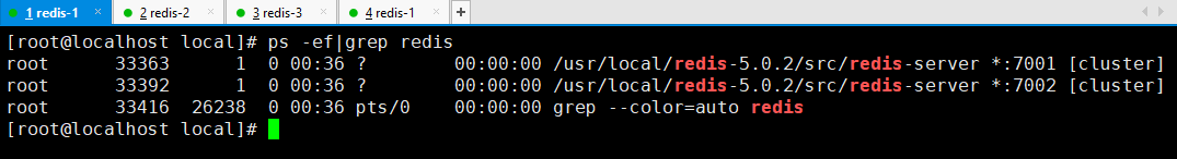 ⑧ 分别启动6个redis实例,然后检查是否启动成功 (1)/usr/local/redis-5.0.2/bin/redis-server /usr/local/redis-5.0.2/redis-cluster/700*/redis.conf (2)ps -ef | grep redis 查看是否启动成功