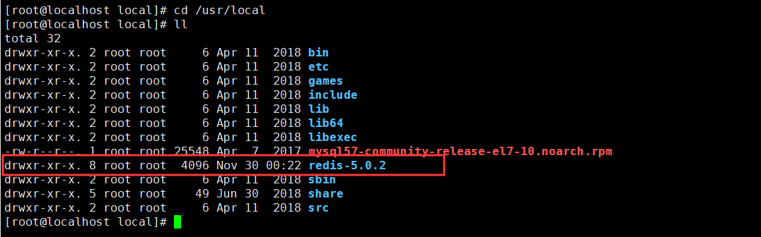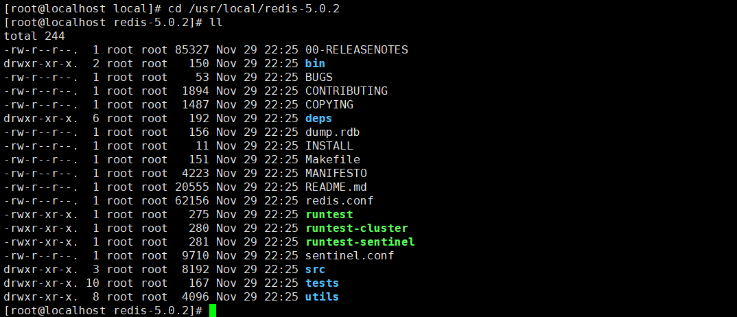 ② 进入redis-5.0.2 cd /usr/local/redis-5.0.2