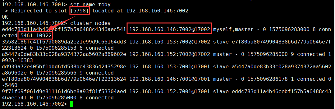 9f71f69f061d9e811161d6be8a93f81f53304aed 192.168.160.152:7001@17001 master - 0 1575046303552 2 connected 5461-10922
