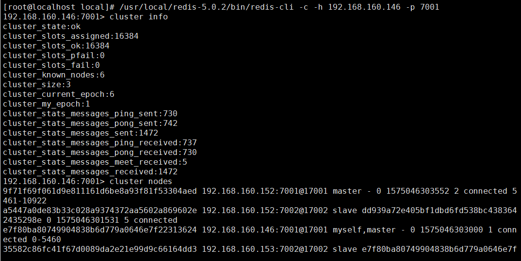 e7f80ba80749904838b6d779a0646e7f22313624 192.168.160.146:7001@17001 myself,master - 0 1575046303000 1 connected 0-5460