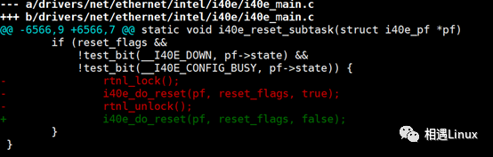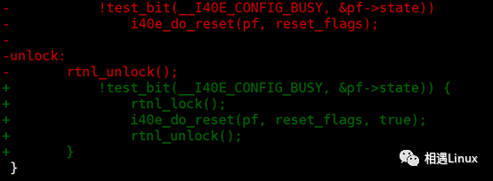 static void i40e_reset_subtask(struct i40e_pf *pf){u32 reset_flags = 0;rtnl_lock();...if (reset_flags &&!test_bit(__I40E_DOWN, &pf->state) &&!test_bit(__I40E_CONFIG_BUSY, &pf->state))i40e_do_reset(pf, reset_flags);unlock:rtnl_unlock();}