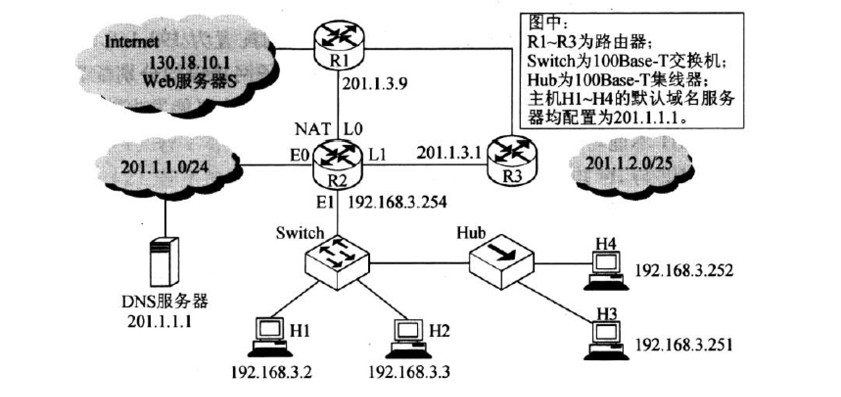 6、假设连接R1、R2和R3之间的点对点链路使用201.1.3.x/30地址,当H3访问Web服务器S时,R2转发出去的封装HTTP请求报文的IP分组的源IP地址和目的IP地址分别是